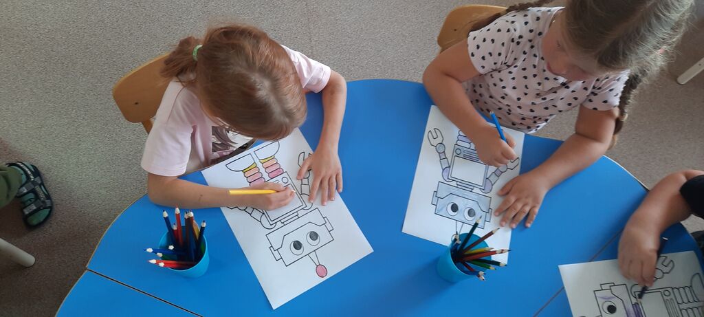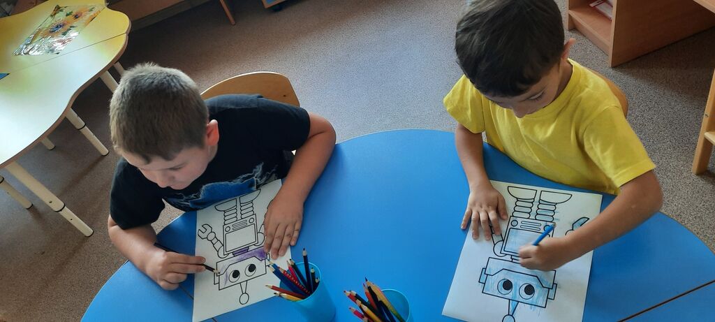 Дети сами придумали робота-помощника воспитателя: озадачились,что пары рук и двух глаз помощнику мало,ведь ему надо так много сделать и за всеми приглядеть, вместо ног придумали колёса,чтобы он успевал за ребятами. И много- много батареек,чтобы на всё хватило энергии.