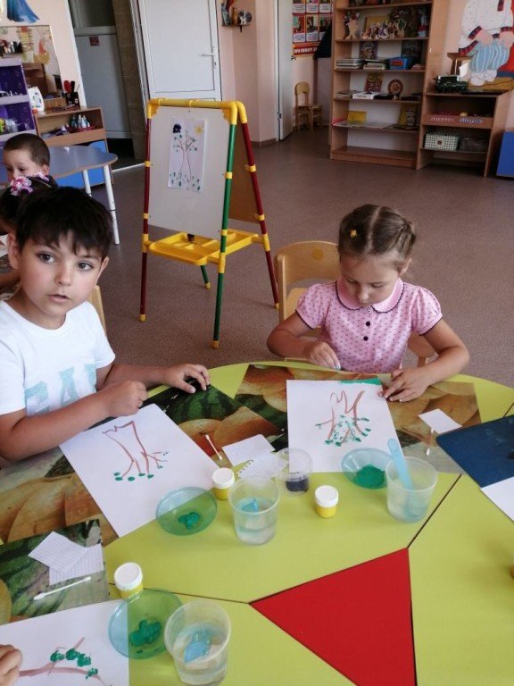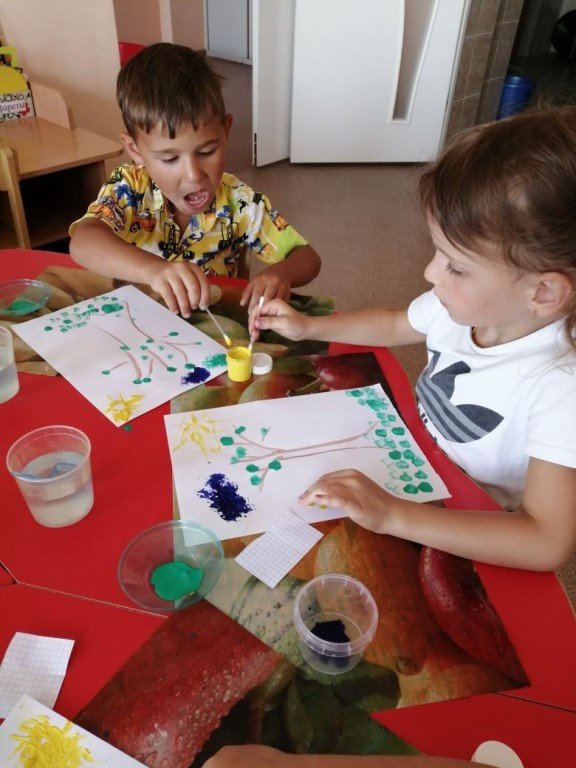 Слева направо. Ника и Саша добавляют осенние цвета к зеленому листику