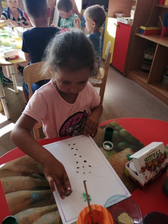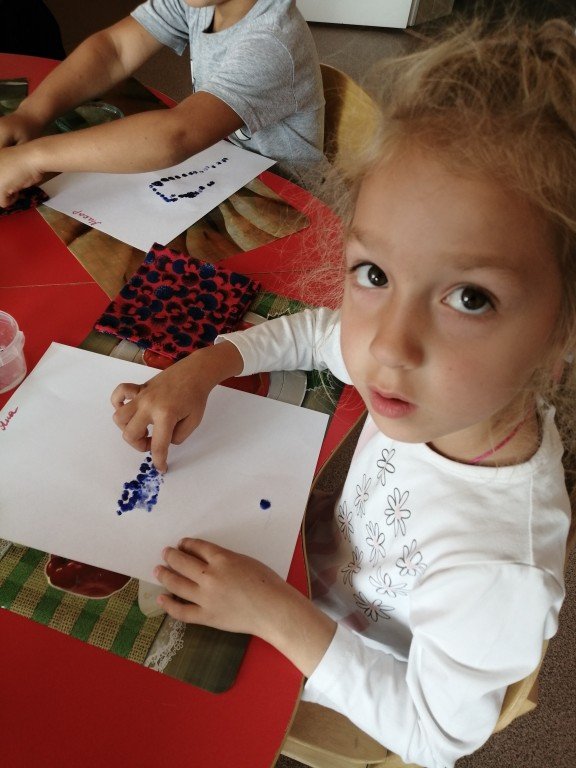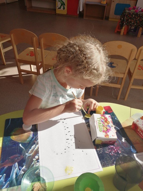 На фото Сонечка, которая делает свои отпечатки