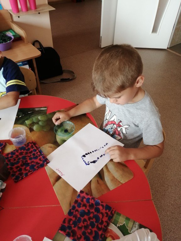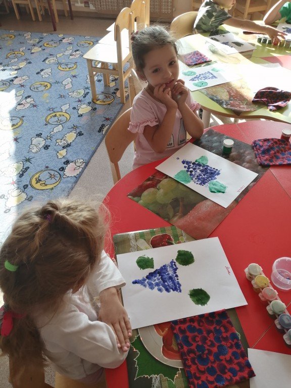 На фото Яночка делает пальчиком ягодки винограда