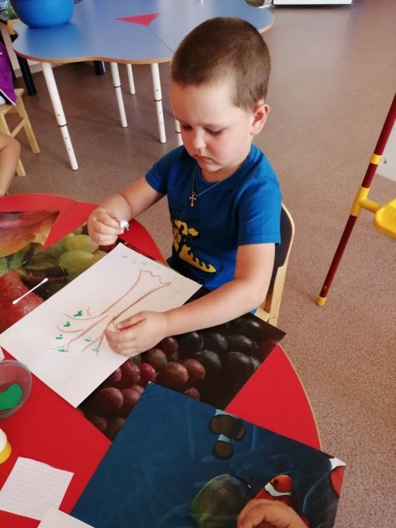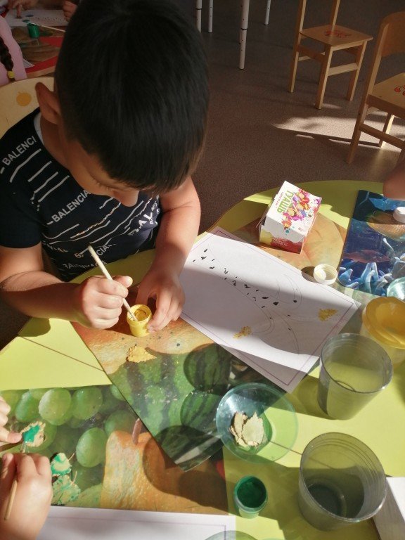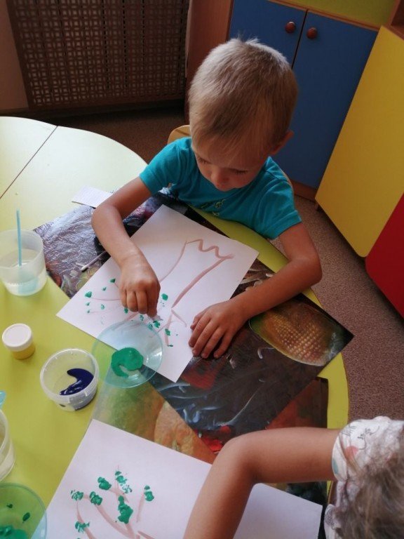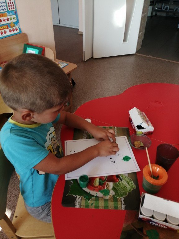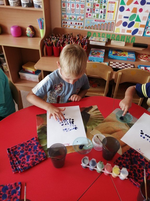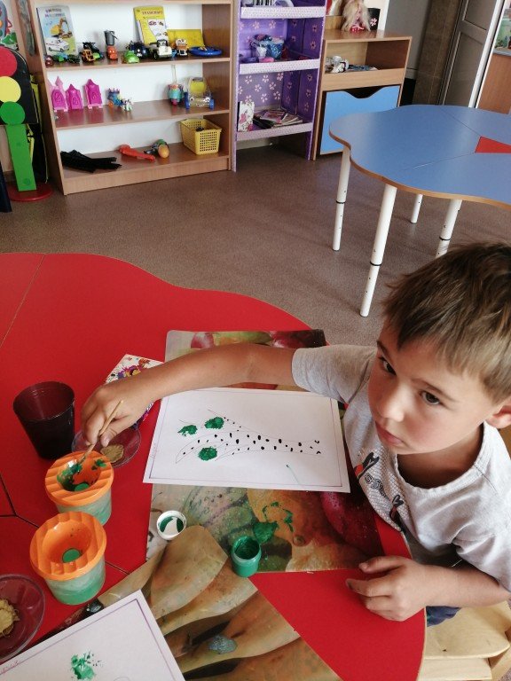 На фото Богдан, который внимательно слушает воспитателя перед тем как наносить краски