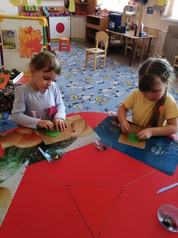навыки «размазывания», «скатывания», «отщипывания» пластилина пальцами по поверхности. Воспитывать интерес к пластилинографии.