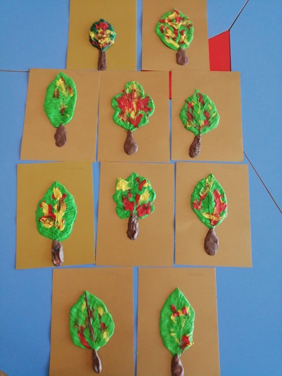 (отпечатки листьями + гуашь )