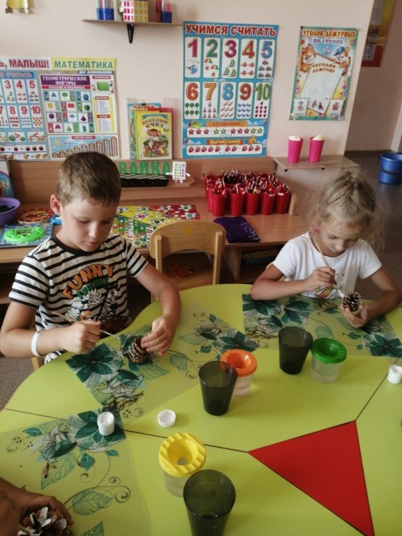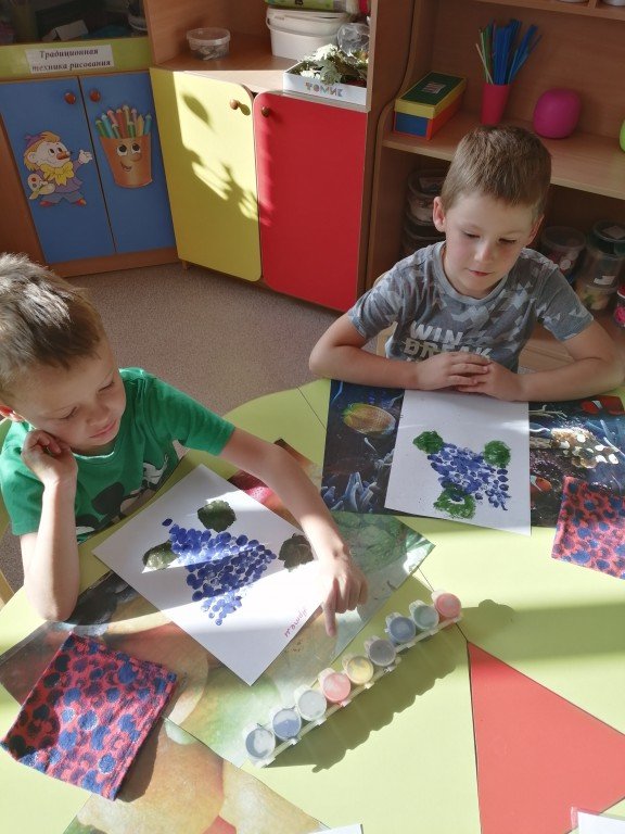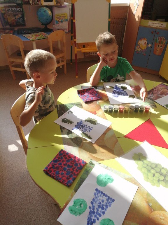 Яночка и Саша внимательно рассматривают свои работы
