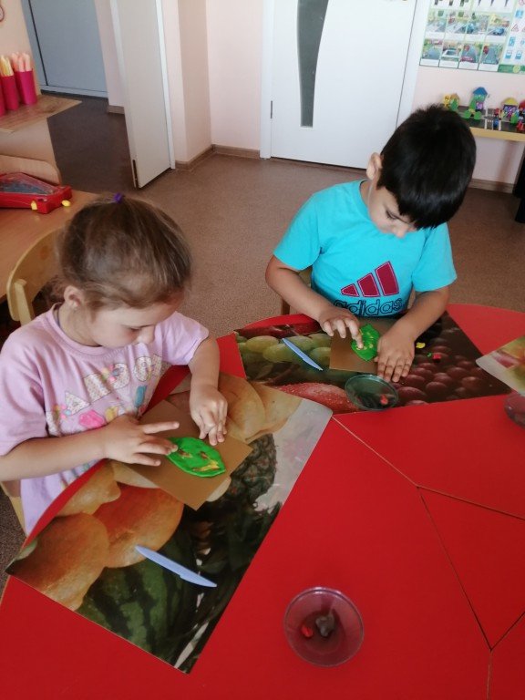 Слева направо. Есения и Макар учатся правильно обращаться стекой в работе с пластилином