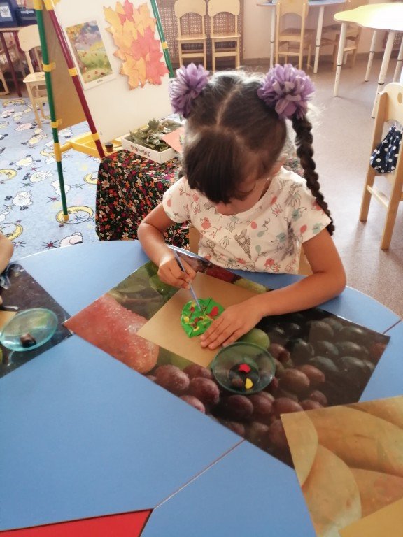 Машенька уверенно обращается стекой при создании своего осеннего листочка