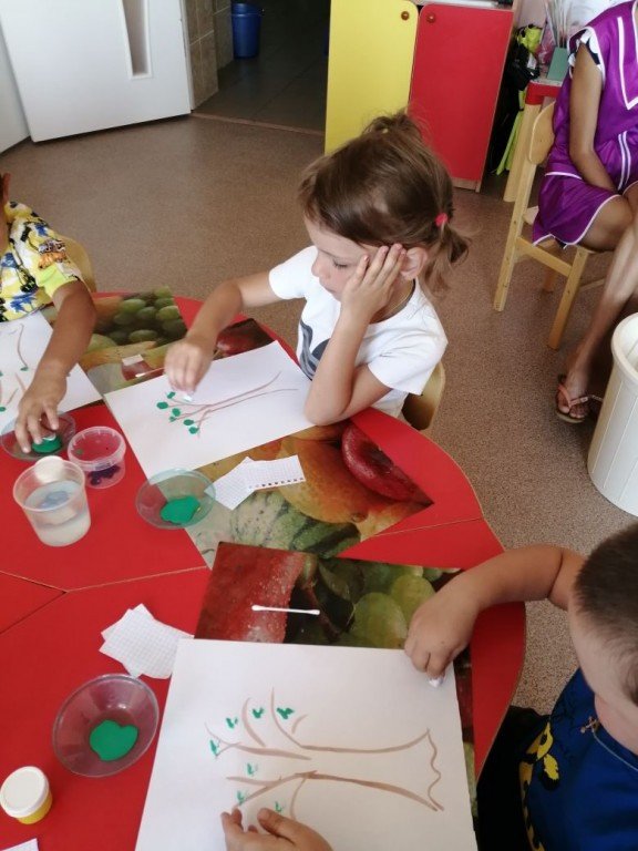 На фото Сонечка смела отпечатывает березовые листики