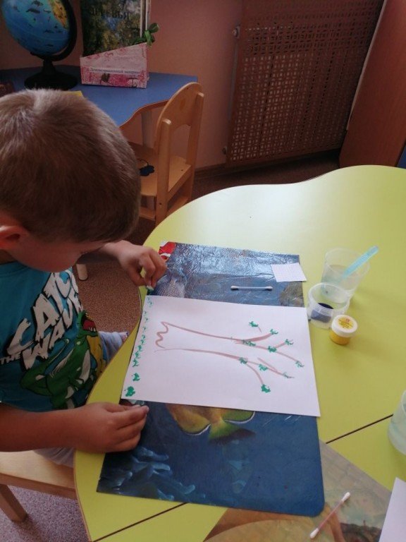 На фото Макар отпечатывает свои березовые листики